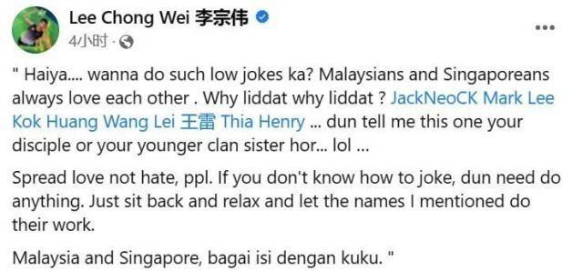 6月8日,马来西亚羽毛球名将李宗伟在社交媒体发文批评乔伊斯林。李宗伟写道:“为什么开那么低级的玩笑?为什么要这么做?”李宗伟表示,要传播爱而不是仇恨,如果你不知道如何开玩笑,就不需要做任何事情。