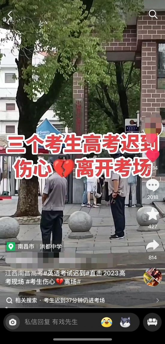 网友拍摄的视频显示,在江西省南昌市洪都中学门口,3名考生从保安亭转身离开,其中有2名男生1名女生。“三个考生高考迟到,伤心离开考场。”该网友在视频中配文写道。