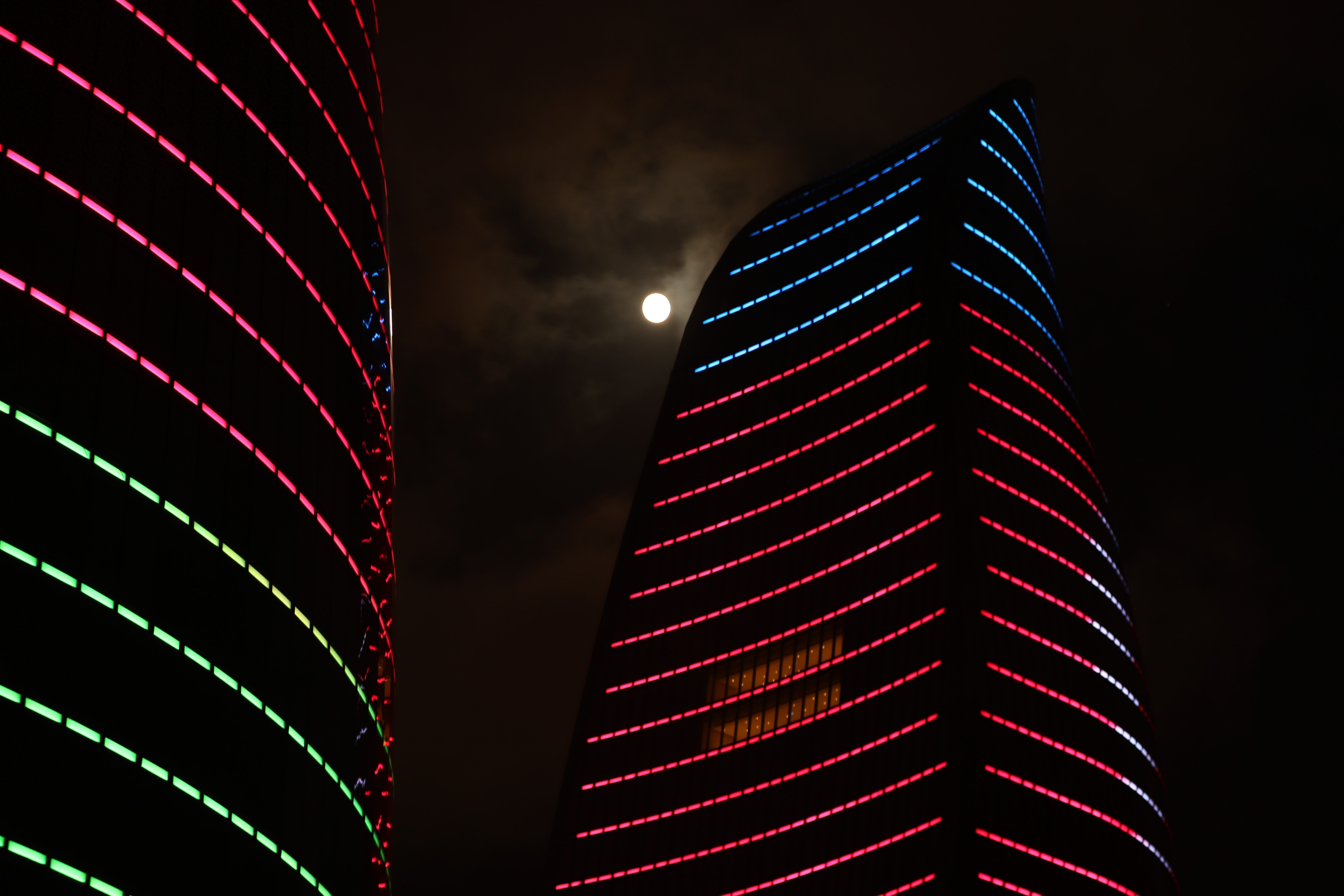 这是10月6日在阿塞拜疆首都巴库的火焰塔拍摄的月亮。